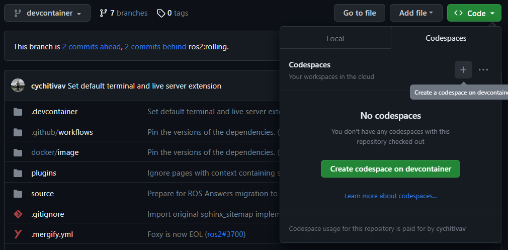 First, you need to have a GitHub account (if you don’t have one, you can create one for free). Then, you need to go to the ROS 2 Documentation GitHub repository. After that, you can open the repository in Codespaces, it can be done just by clicking on the “Code” button on the repository page, then choose “Open with Codespaces” from the dropdown menu.