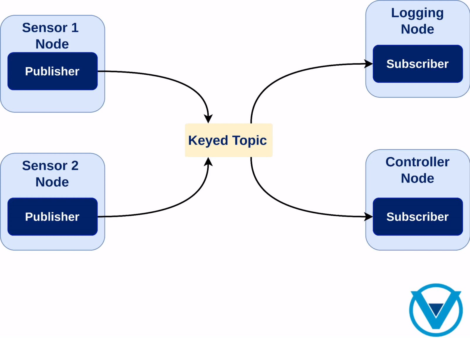In a keyed topic, every message is associated with a topic instance and each topic instance is identified by a unique key. This key allows nodes to update different states of the same kind. In this sense, keys can be thought as the “primary key” of a database. While a topic’s message is used to represent the state of a real world object, each unique key corresponds to the specific topic instance to which the topic’s message belongs.