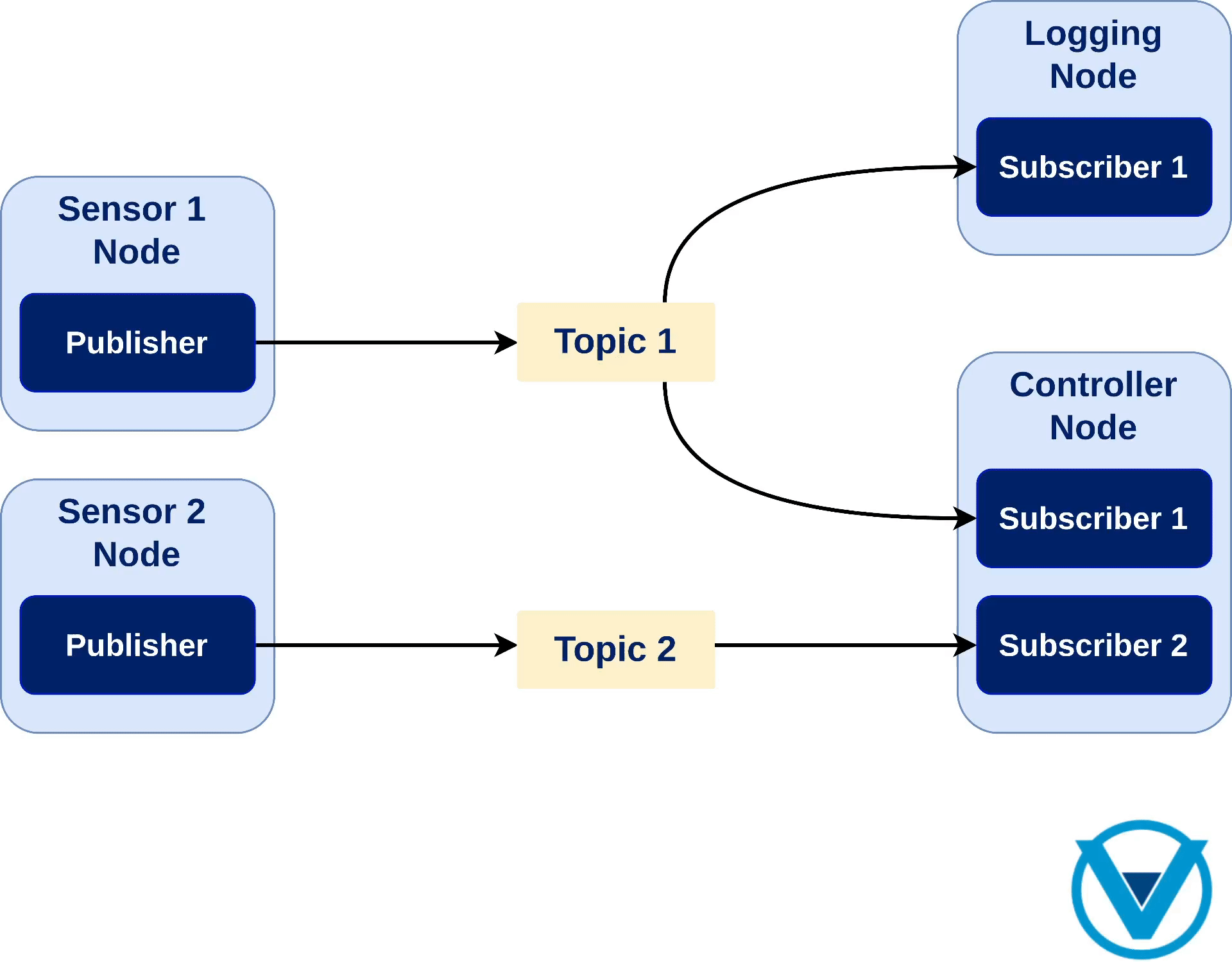 The following image depicts a simple scenario where two sensors publish data in different topics, and two remote nodes subscribe to it.